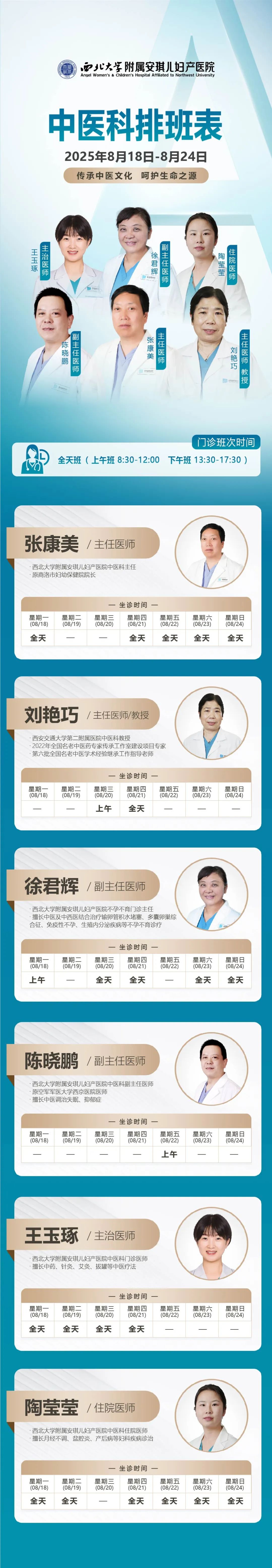 西安安琪儿妇产医院(8月18日至8月24日)专家坐诊时间表