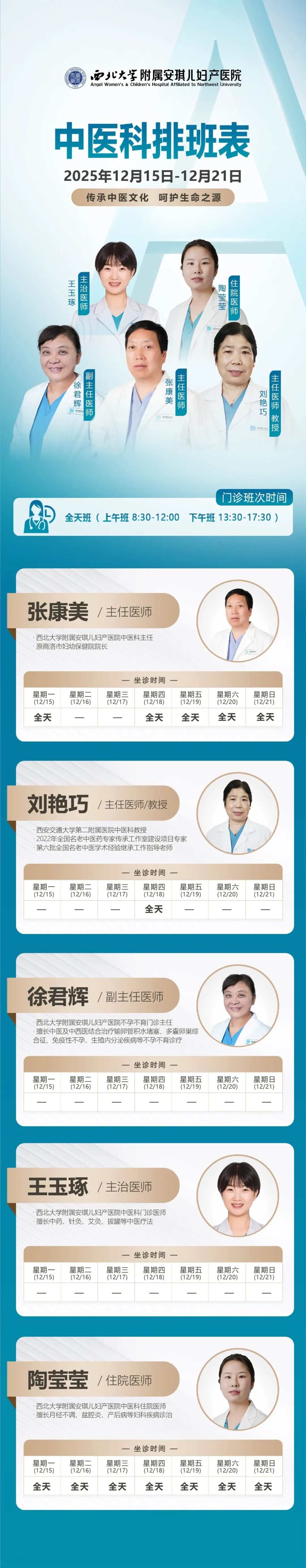 西安安琪儿妇产医院(12月15日至12月21日)专家坐诊时间表